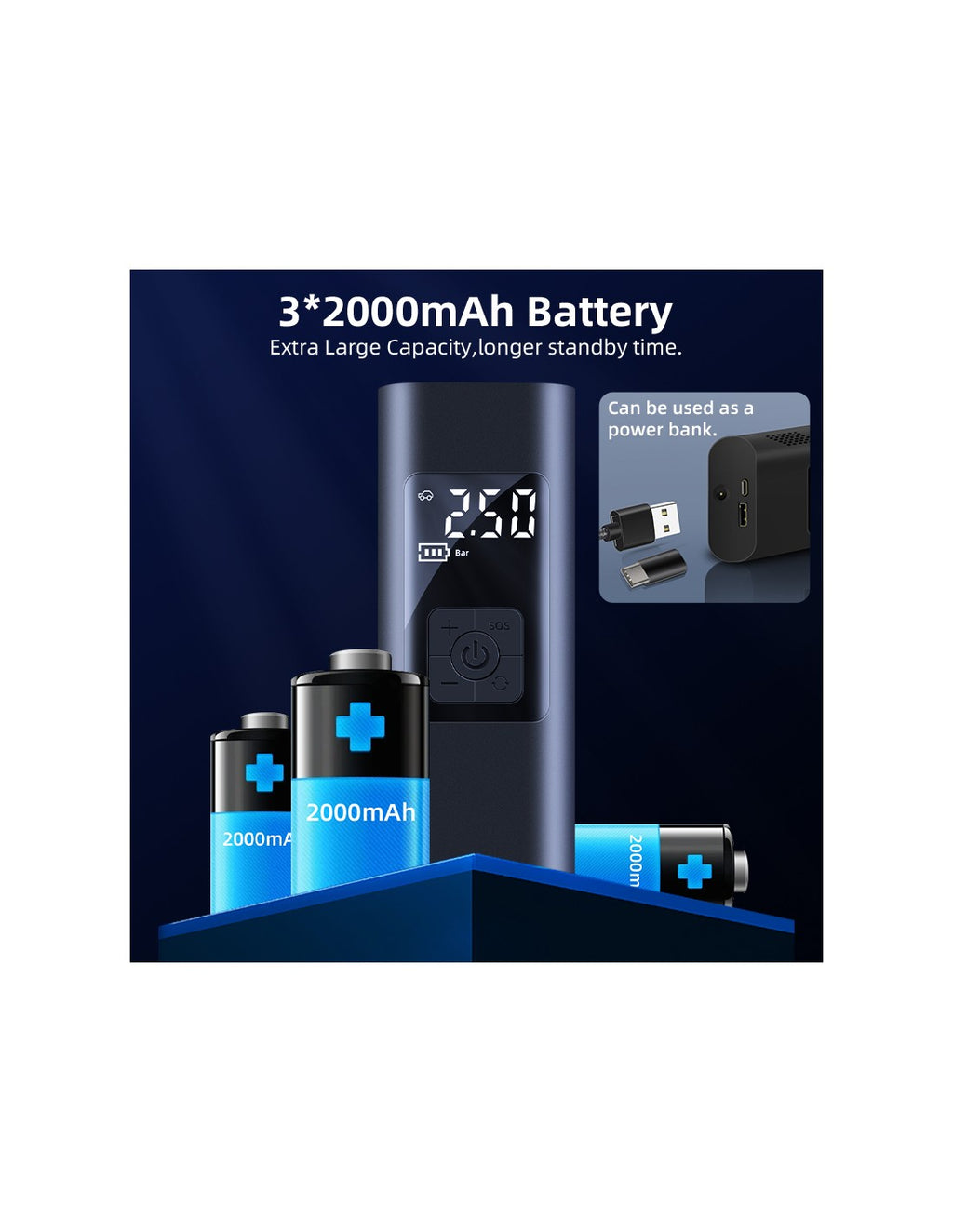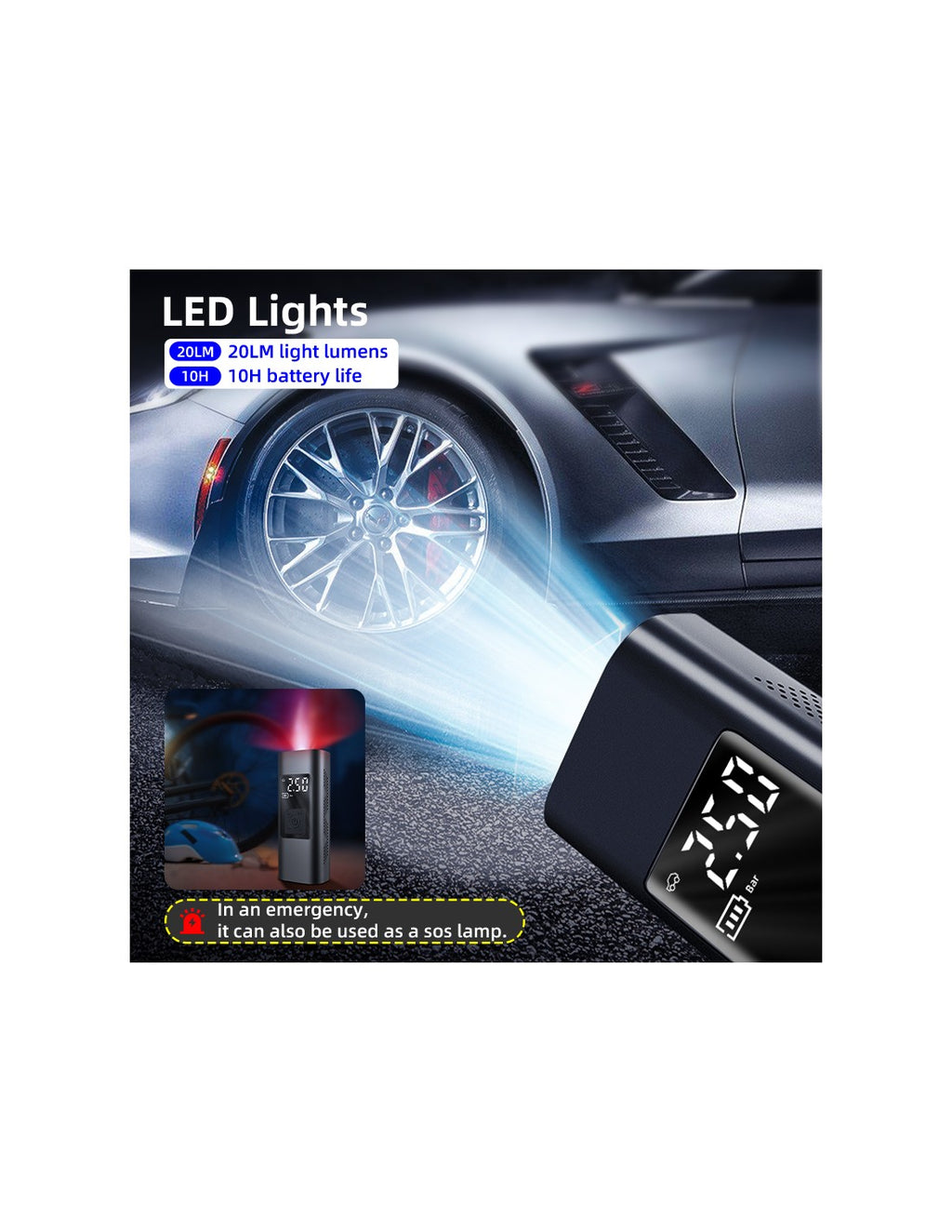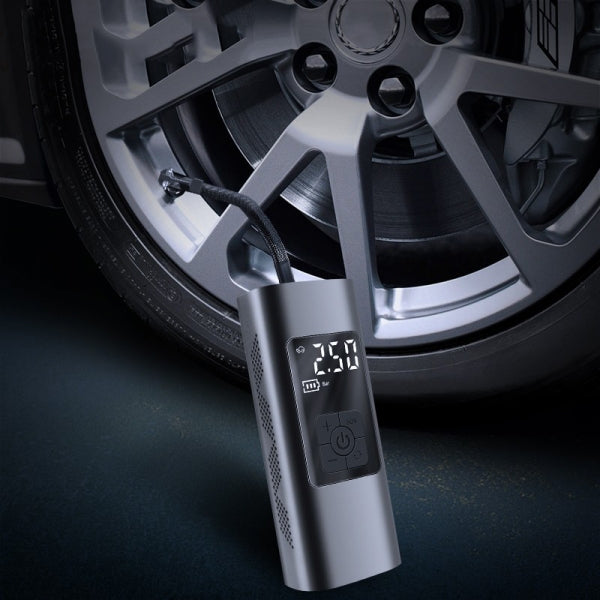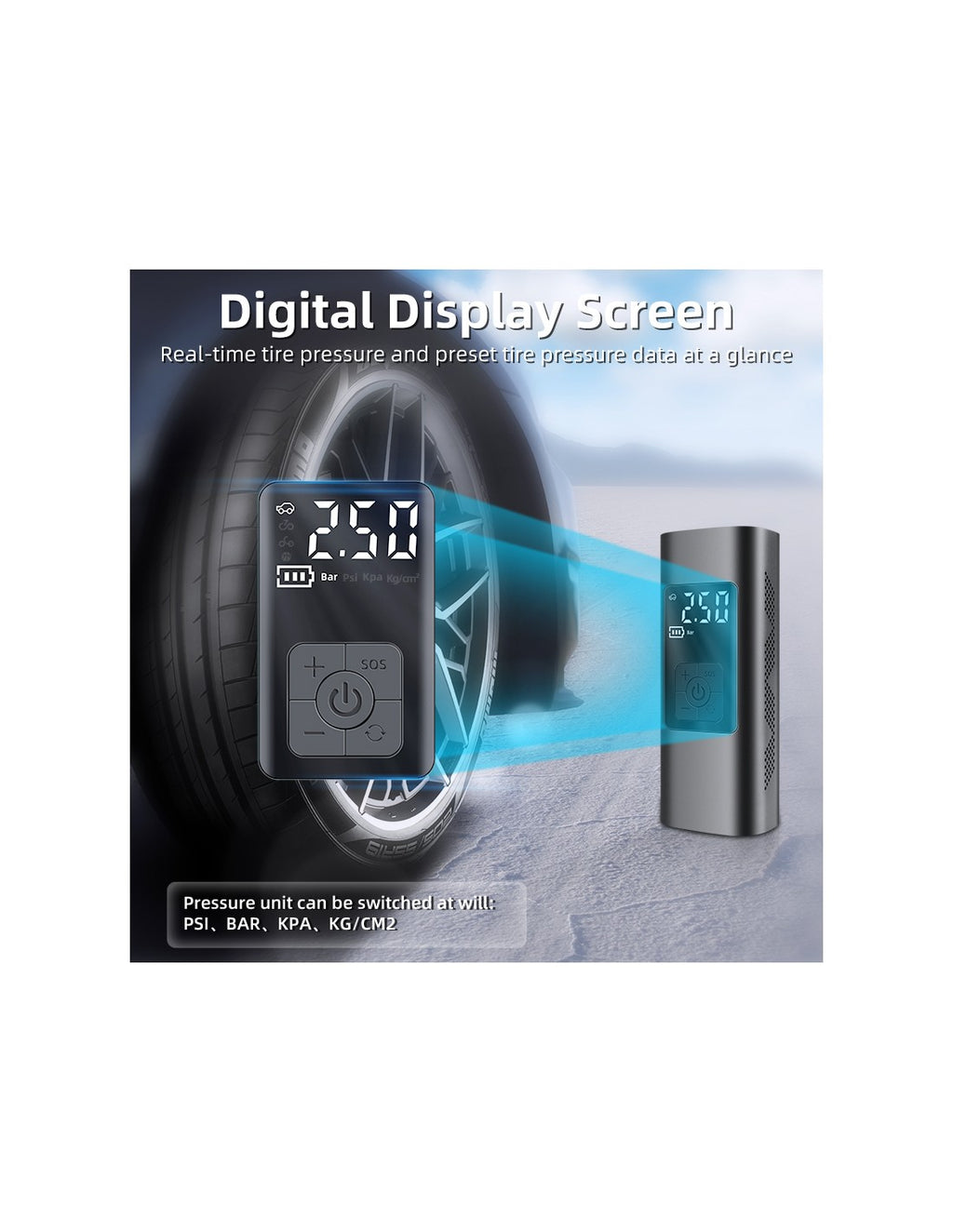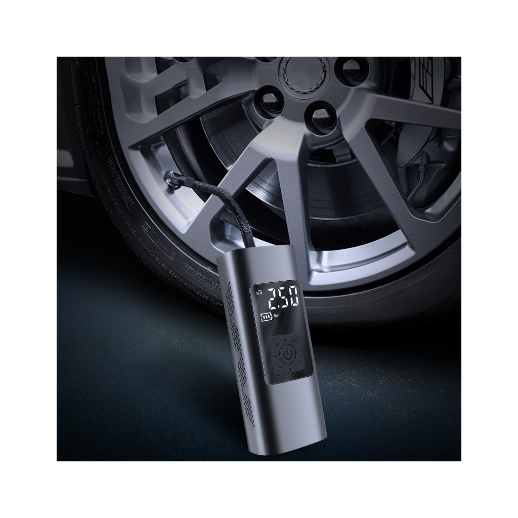 Compressor de Ar Portátil Digital para PneusFacilite o enchimento dos seus pneus com este compressor de ar portátil digital, compacto e prático. Ideal para automóveis, bicicletas, motos e até mesmo bolas desportivas.Características Principais:Ecrã Digital:Monitorize a pressão em tempo real e ajuste facilmente ao nível desejado.Design Compacto:Fácil de transportar e guardar no carro ou em casa.Autonomia Recarregável:Bateria interna de alta capacidade, recarregável via USB.Modo Automático:Desliga-se automaticamente ao atingir a pressão pré-definida.Versatilidade de Uso:Inclui adaptadores para diferentes tipos de válvulas.Especificações Técnicas:Pressão Máxima:150 PSIFonte de Alimentação:Bateria recarregável via USB-CDimensões:18 cm x 6 cm x 6 cmPeso:450gAcessórios:Mangueira flexível, adaptadores para válvulas e cabo de carregamento USB