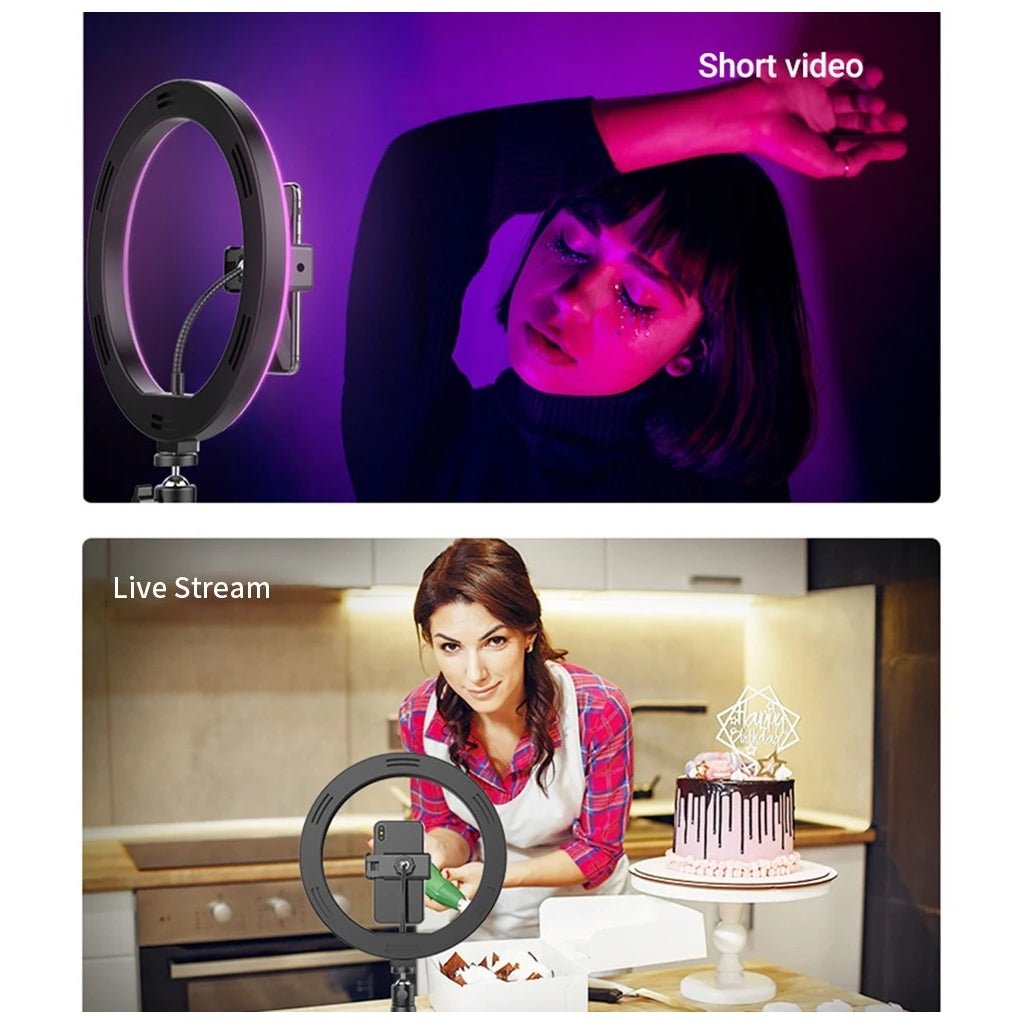 Ring Light RGB com Tripé e Controle RemotoTransforme a qualidade das suas fotos e vídeos com esteRing Light RGB, ideal para criadores de conteúdo, streamers e amantes de fotografia. Com um tripé ajustável e controle remoto, você terá iluminação profissional com facilidade.Características Principais:Iluminação RGB:Efeitos coloridos para criar o ambiente perfeito.Temperatura ajustável:Controle tons quentes e frios para diferentes necessidades.Tripé estável:Altura ajustável e estrutura robusta.Controle remoto sem fio:Configure à distância com rapidez e praticidade.Suporte para telemóvel:Compatível com a maioria dos smartphones.Ideal para:Fotografia, vídeos, maquiagem, lives e chamadas de vídeo.