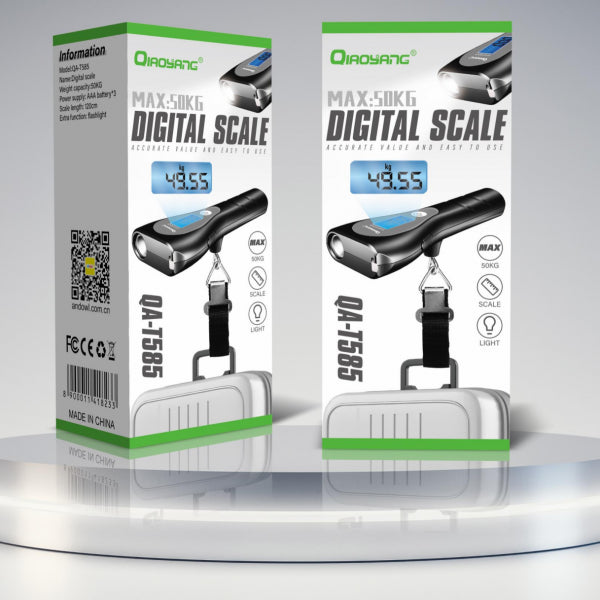 Balança Digital Portátil QA-T585 – Precisão e Praticidade em Qualquer LugarA Balança Digital Portátil QA-T585 é o acessório ideal para medir o peso de bagagens, compras ou qualquer outro objeto até 50 kg, com máxima precisão. Compacta e leve, esta balança foi desenvolvida para facilitar o transporte e proporcionar uma experiência de uso simples e prática, ideal para viagens ou uso doméstico.Características Principais:Capacidade Máxima:Até 50 kg, com leitura precisa e rápida.Ecrã Digital LED:Exibição clara e fácil de ler, mesmo em ambientes com pouca luz.Função Extra:Inclui uma lanterna integrada para maior versatilidade.Desenho Ergonómico:Fácil de segurar e manusear.Leve e Portátil:Ideal para viagens e uso diário.Modo de Medição Ajustável:Permite alternar entre diferentes unidades de peso (kg/lb).Benefícios:Evite Sobrecargas em Viagens:Garanta que a sua bagagem está dentro dos limites permitidos pelas companhias aéreas.Facilidade de Uso:Basta pendurar o objeto e obter a leitura em segundos.Multifuncional:Adequada para várias necessidades, desde o uso em viagens até tarefas domésticas.Especificações Técnicas:Modelo:QA-T585Capacidade Máxima:50 kgFonte de Alimentação:2 pilhas AAA (não incluídas)Ecrã:LED retroiluminadoMaterial:Plástico ABS durávelTamanho da Correia:120 cmDimensões:Compacta e fácil de guardar
