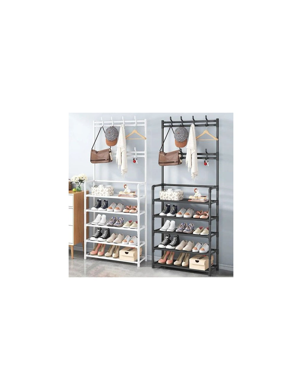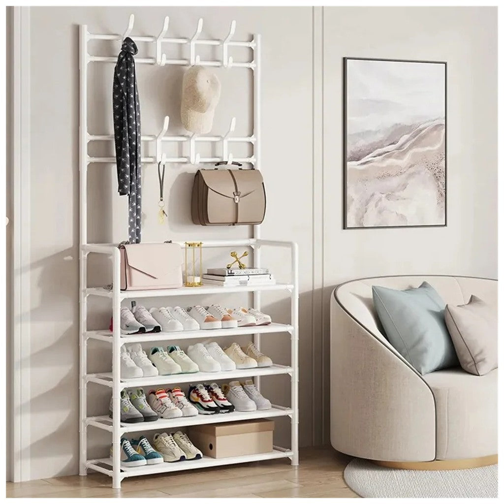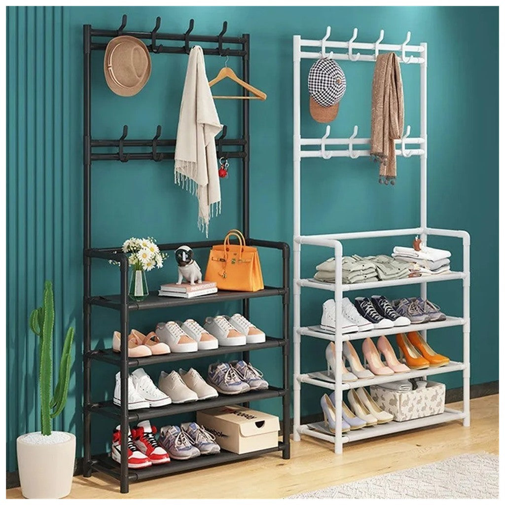 Cabide Organizador Multifuncional com Prateleiras – Organização e EstiloMaximize o espaço da sua entrada, quarto ou sala com este cabide organizador multifuncional. Equipado com prateleiras espaçosas e ganchos para pendurar roupas, bolsas e acessórios, combina funcionalidade com um design moderno e elegante.Características✔Design Multifuncional: Inclui ganchos superiores para pendurar casacos, chapéus e bolsas, além de prateleiras para guardar sapatos, livros ou objetos decorativos.✔Estrutura Robusta: Fabricado com materiais de alta qualidade que garantem estabilidade e durabilidade.✔Economia de Espaço: Ideal para entradas, quartos ou qualquer espaço que necessite de organização extra.✔Fácil Montagem: Montagem simples com instruções claras, sem necessidade de ferramentas complicadas.✔Estilo Moderno: Disponível em cores neutras que se adaptam a qualquer decoração.EspecificaçõesMaterial: Estrutura metálica com acabamentos de qualidadeDimensões: Compacto para caber em espaços pequenos, mas com capacidade suficiente para múltiplos itensCores Disponíveis: Preto e brancoCapacidade: Ideal para organizar até 10 pares de sapatos, acessórios e roupas leves