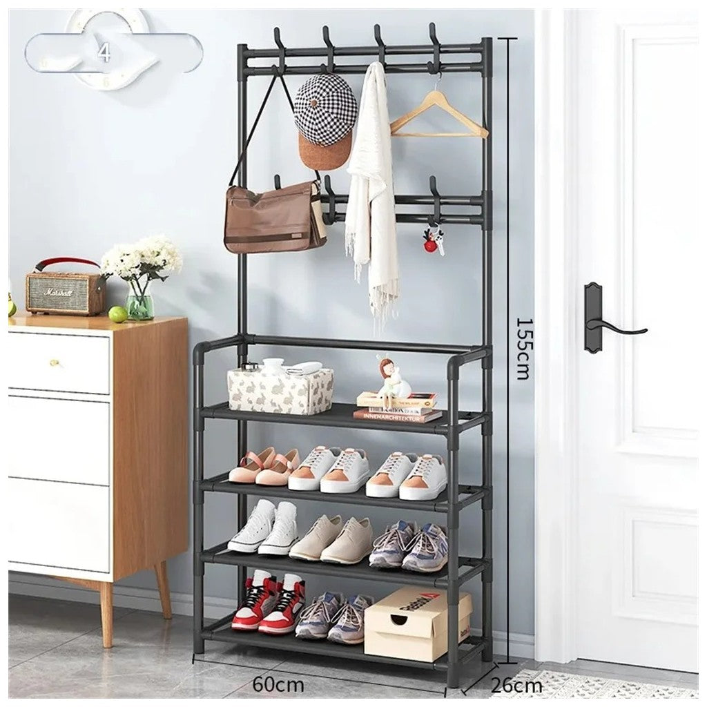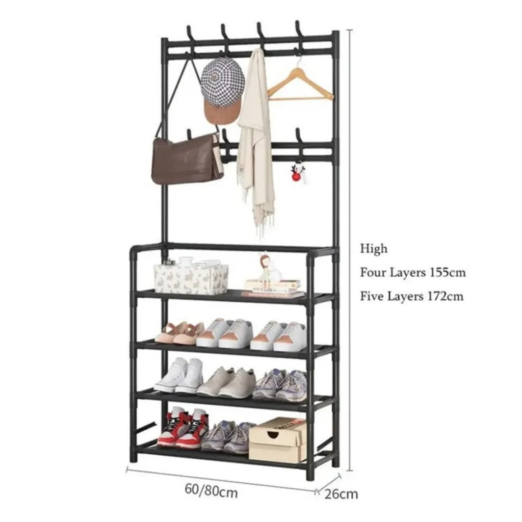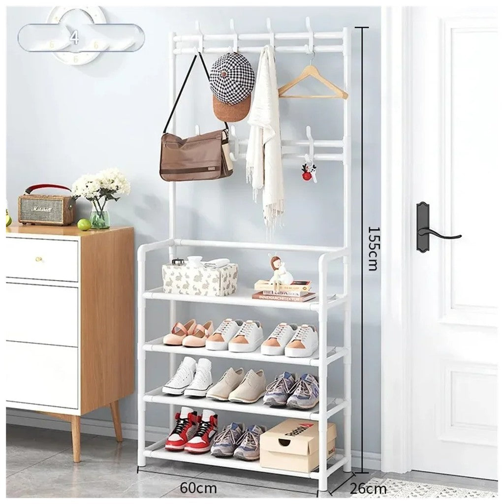 Cabide Organizador Multifuncional com Prateleiras – Organização e EstiloMaximize o espaço da sua entrada, quarto ou sala com este cabide organizador multifuncional. Equipado com prateleiras espaçosas e ganchos para pendurar roupas, bolsas e acessórios, combina funcionalidade com um design moderno e elegante.Características✔Design Multifuncional: Inclui ganchos superiores para pendurar casacos, chapéus e bolsas, além de prateleiras para guardar sapatos, livros ou objetos decorativos.✔Estrutura Robusta: Fabricado com materiais de alta qualidade que garantem estabilidade e durabilidade.✔Economia de Espaço: Ideal para entradas, quartos ou qualquer espaço que necessite de organização extra.✔Fácil Montagem: Montagem simples com instruções claras, sem necessidade de ferramentas complicadas.✔Estilo Moderno: Disponível em cores neutras que se adaptam a qualquer decoração.EspecificaçõesMaterial: Estrutura metálica com acabamentos de qualidadeDimensões: Compacto para caber em espaços pequenos, mas com capacidade suficiente para múltiplos itensCores Disponíveis: Preto e brancoCapacidade: Ideal para organizar até 10 pares de sapatos, acessórios e roupas leves