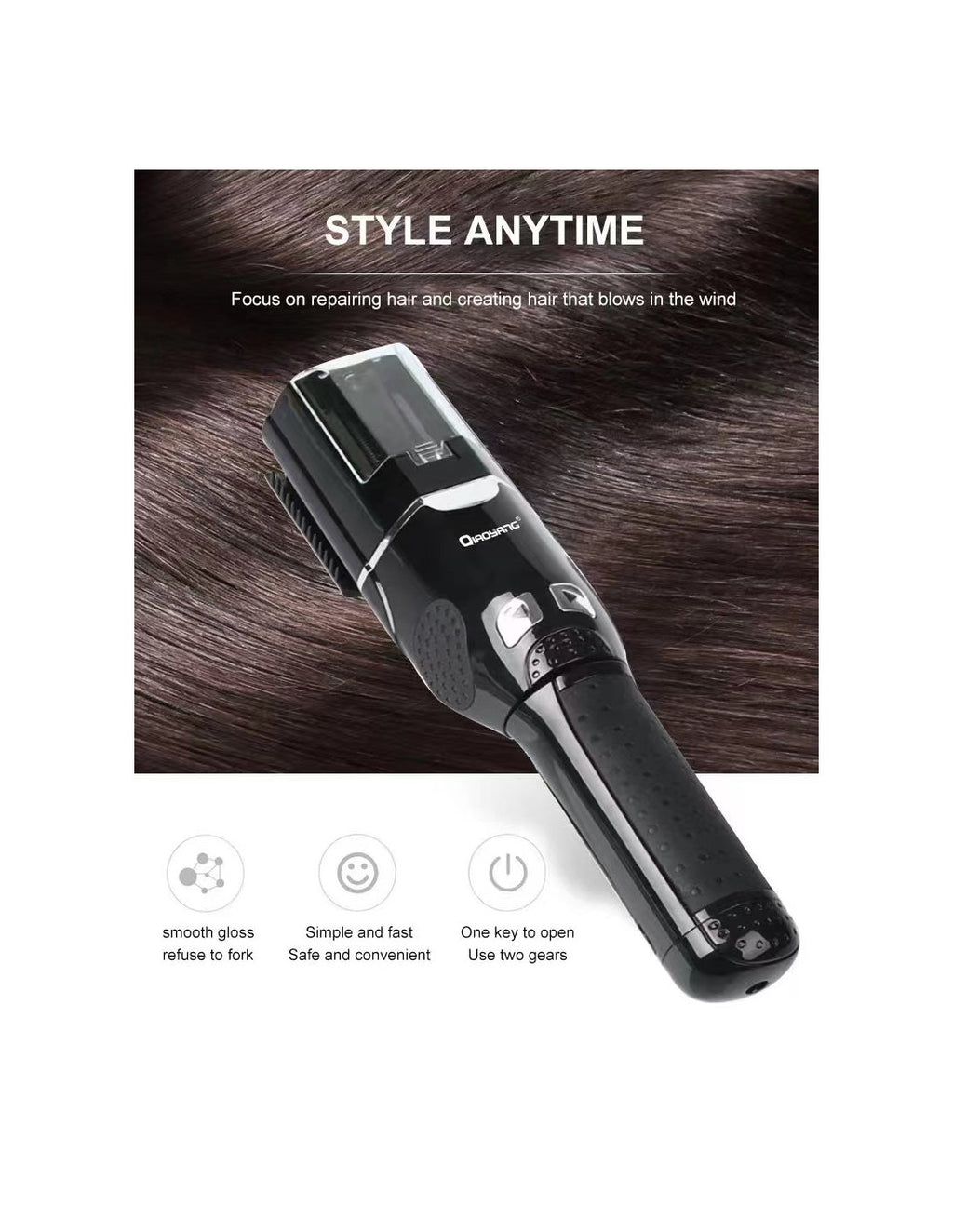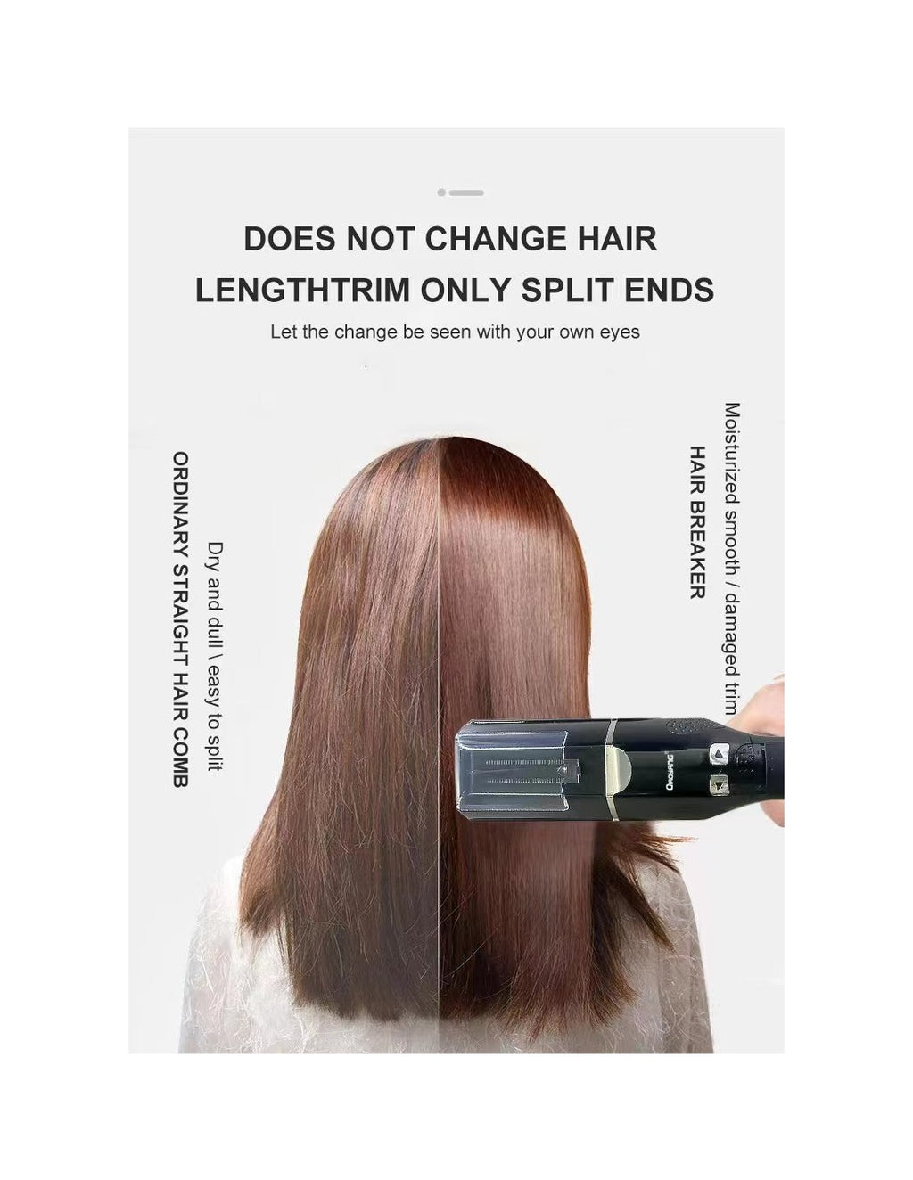 Reparador e Aparador de Pontas EspigadasOReparador e Aparador de Pontas Espigadas Clinks Fasizé um dispositivo inovador projetado para eliminar pontas duplas e promover um cabelo mais saudável e brilhante.Características principais:Tecnologia Avançada:Remove eficazmente as pontas espigadas sem comprometer o comprimento do cabelo.Fácil de Usar:Design ergonómico que facilita o manuseio durante o uso.Seguro e Suave:Adequado para todos os tipos de cabelo, garantindo um corte preciso e seguro.Portátil:Leve e compacto, ideal para uso em casa ou em viagens.Especificações Técnicas:Material:Plástico ABS de alta qualidade.Alimentação:Bateria recarregável com autonomia de até 60 minutos.Tempo de Carregamento:Aproximadamente 3 horas.Peso:450g.Dimensões:25 cm x 7 cm x 4 cm.