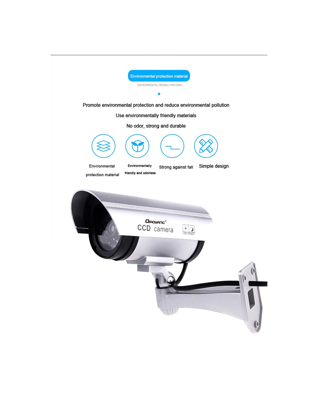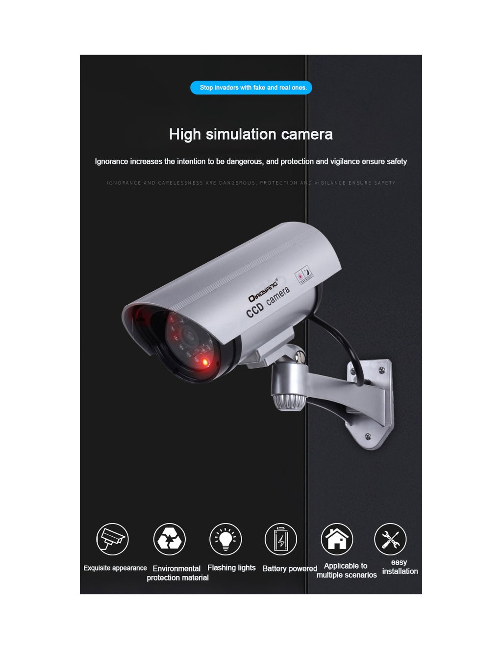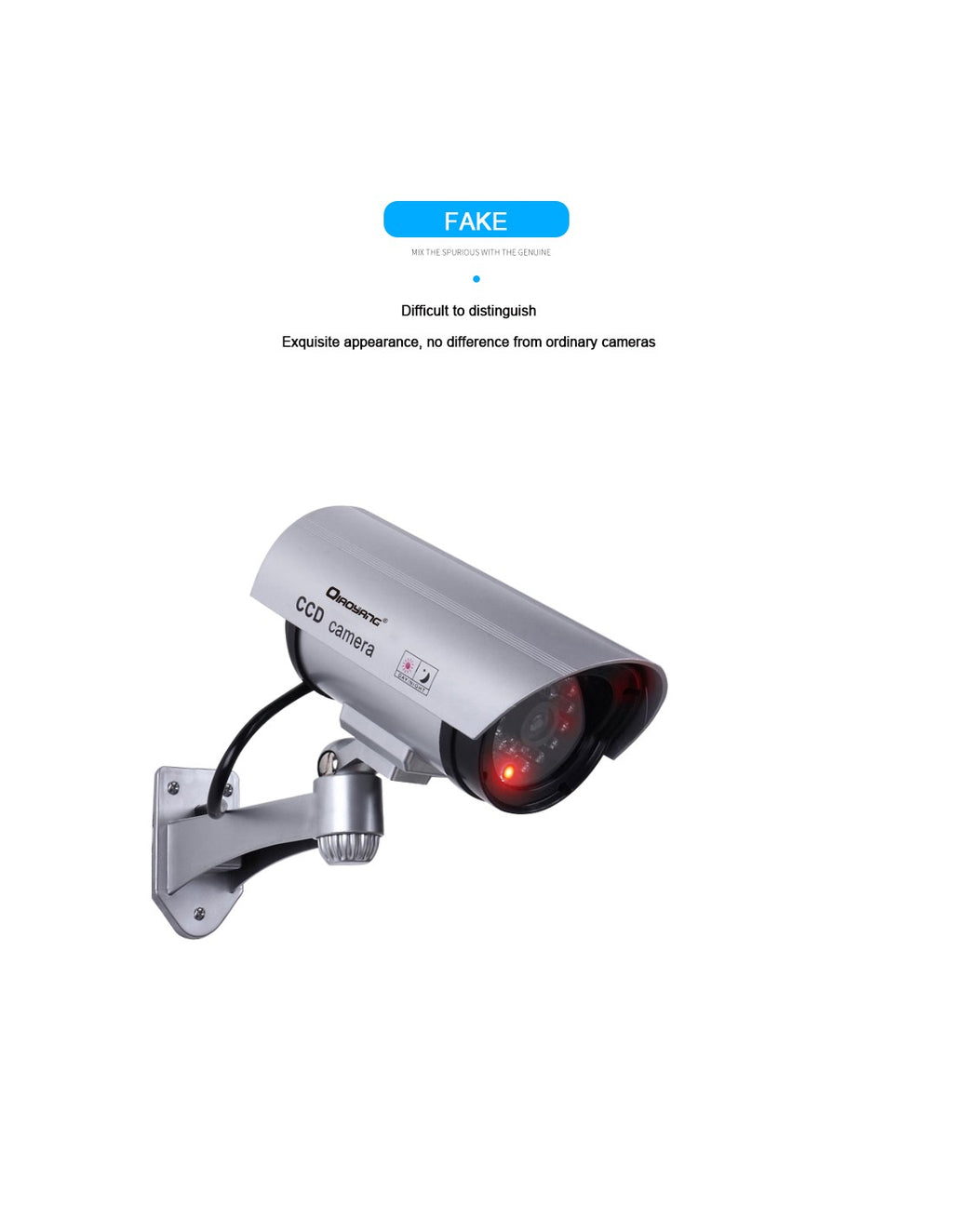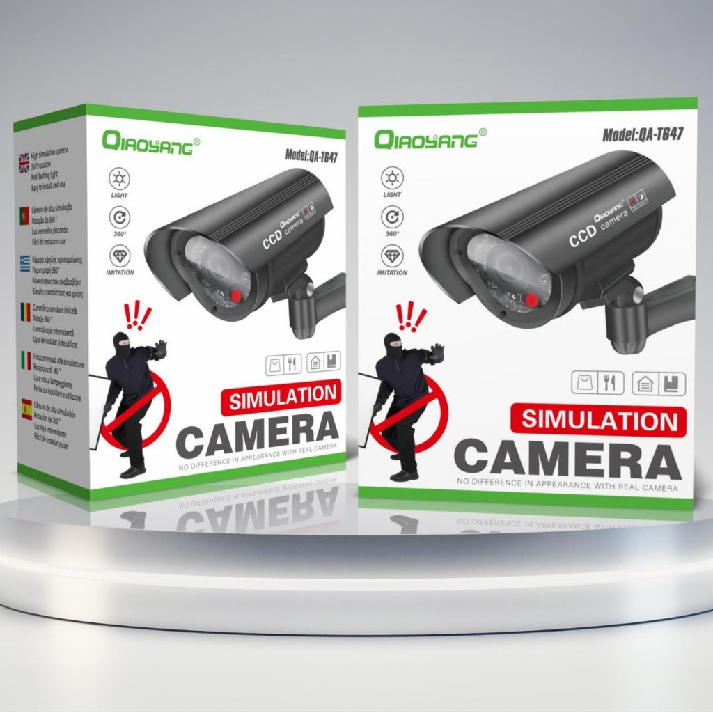 Câmara de Simulação QA-T647 – Segurança e DiscreçãoA Câmara de Simulação QA-T647 é a solução perfeita para aumentar a segurança da sua casa, escritório ou negócio, criando a impressão de monitorização constante. Com design realista e LED de funcionamento, esta câmara dissuasora é ideal para prevenir intrusos de forma económica e eficaz.Características Principais:Design Autêntico:Aparência idêntica a uma câmara real, incluindo LED vermelho intermitente.Instalação Fácil:Não necessita de cabos ou ferramentas complexas.Amplo Ângulo de Visão:Simula uma cobertura de 360°, garantindo máxima visibilidade.Baixo Consumo de Energia:Alimentada por baterias AA (não incluídas).Vantagens:Dissuasão Eficaz:Ideal para afastar possíveis intrusos sem grandes investimentos.Versátil:Pode ser instalada em interiores ou exteriores.Manutenção Simples:Basta substituir as baterias quando necessário.Custo-Benefício:Oferece segurança a um preço acessível.Especificações Técnicas:Modelo:QA-T647Material:ABS resistenteFonte de Energia:2x pilhas AADimensões:Compacta e leve, adaptável a diferentes locaisCor:Preto