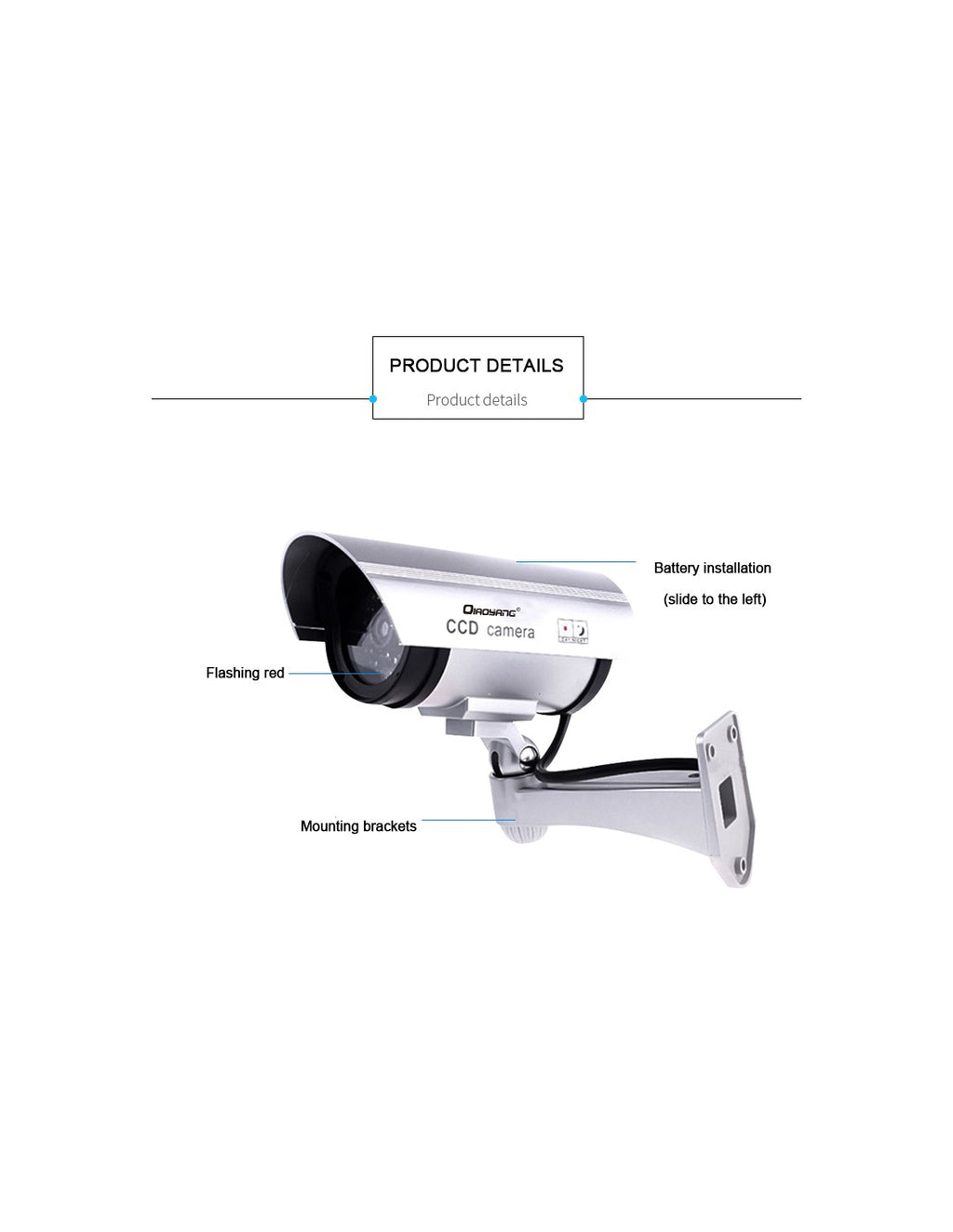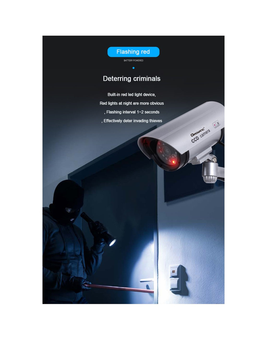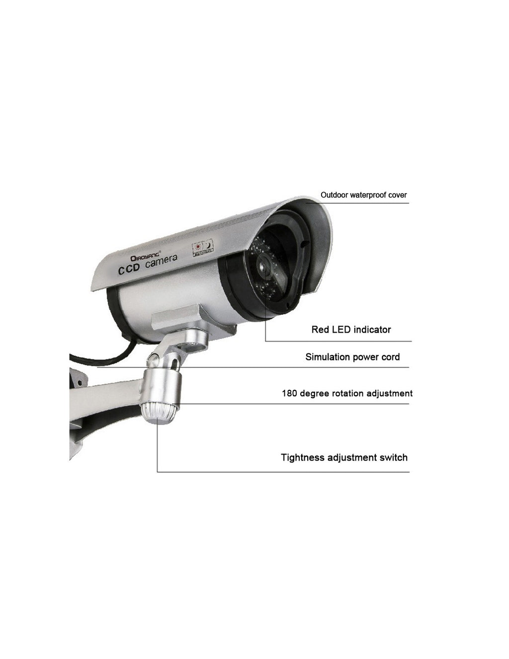 Câmara de Simulação QA-T647 – Segurança e DiscreçãoA Câmara de Simulação QA-T647 é a solução perfeita para aumentar a segurança da sua casa, escritório ou negócio, criando a impressão de monitorização constante. Com design realista e LED de funcionamento, esta câmara dissuasora é ideal para prevenir intrusos de forma económica e eficaz.Características Principais:Design Autêntico:Aparência idêntica a uma câmara real, incluindo LED vermelho intermitente.Instalação Fácil:Não necessita de cabos ou ferramentas complexas.Amplo Ângulo de Visão:Simula uma cobertura de 360°, garantindo máxima visibilidade.Baixo Consumo de Energia:Alimentada por baterias AA (não incluídas).Vantagens:Dissuasão Eficaz:Ideal para afastar possíveis intrusos sem grandes investimentos.Versátil:Pode ser instalada em interiores ou exteriores.Manutenção Simples:Basta substituir as baterias quando necessário.Custo-Benefício:Oferece segurança a um preço acessível.Especificações Técnicas:Modelo:QA-T647Material:ABS resistenteFonte de Energia:2x pilhas AADimensões:Compacta e leve, adaptável a diferentes locaisCor:Preto