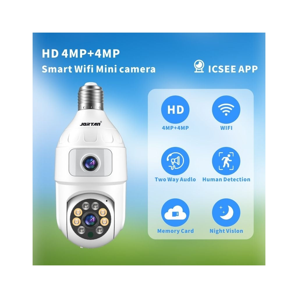 Câmara de Vigilância JORTAN JT-9666 Wi-Fi com Rosca E27A JORTAN JT-9666 é uma câmara de vigilância Wi-Fi compacta e versátil, com encaixe para rosca E27, ideal para instalação rápida e discreta em ambientes interiores. Proporciona segurança completa com visão noturna a cores, deteção de movimento e acesso remoto pelo telemóvel.Características:Instalação direta em casquilho E27 (sem necessidade de fios)Ligação Wi-Fi com acesso remoto via app (compatível com Android e iOS)Visão noturna a cores e infravermelhaDetecção inteligente de movimento com alertas em tempo realÁudio bidirecional com microfone e altifalante integradosGravação em cartão MicroSD (até 128GB)Resolução HD com imagem nítida de dia e de noiteCertificação IP44 (resistente a salpicos e poeira)Benefícios:Instalação ultra simples, basta rosquear como uma lâmpadaMonitorização total da divisão mesmo no escuroComunicação com quem estiver no local, em tempo realRecebe alertas no telemóvel sempre que for detetado movimentoIdeal para apartamentos, entradas, garagens, escritórios e lojas
