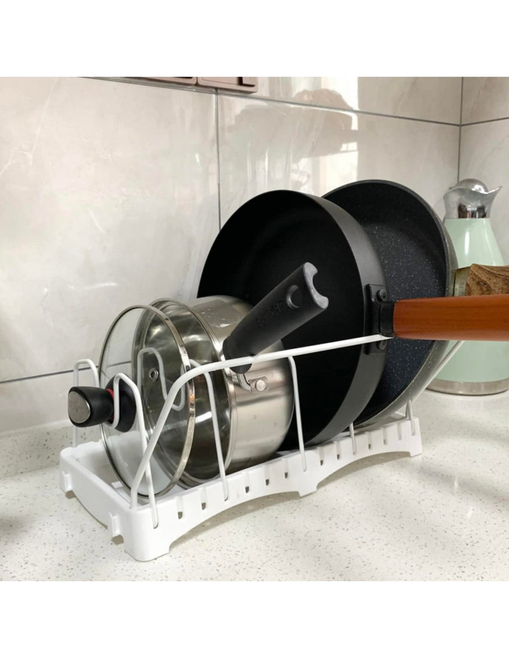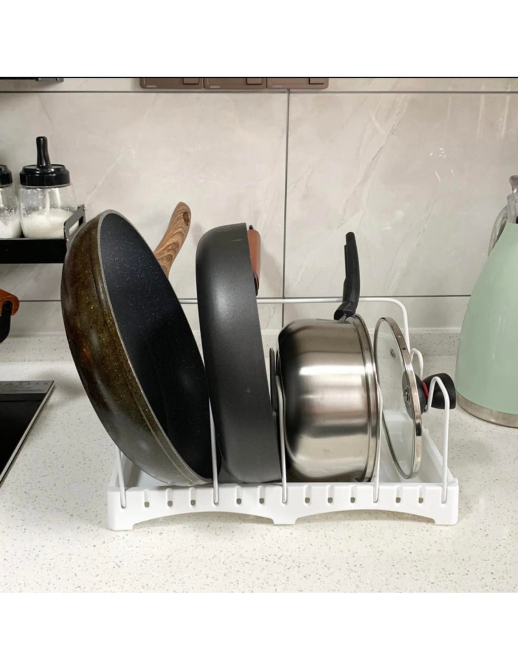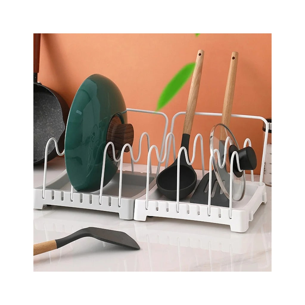 Organizador de Panelas e Tampas ModularMantenha a sua cozinha sempre arrumada e funcional com este práticoOrganizador de Panelas e Tampas Modular. Ideal para otimizar o espaço, permite organizar tampas, frigideiras e utensílios de forma eficiente, oferecendo praticidade no dia a dia.Características Principais:Design Modular:Pode ser ajustado de acordo com o espaço disponível, permitindo uma configuração personalizada.Material Durável:Feito em aço com revestimento antirrust, garantindo durabilidade e resistência à corrosão.Base Antiderrapante:Oferece maior estabilidade durante o uso.Fácil de Limpar:A superfície revestida facilita a limpeza com apenas um pano húmido.Versatilidade:Ideal para tampas, panelas, frigideiras e utensílios de cozinha.Vantagens:Otimiza o espaço na bancada ou dentro do armário.Facilita o acesso aos utensílios e panelas durante o uso.Design moderno que combina com qualquer decoração de cozinha.Especificações Técnicas:Material:Aço carbono com revestimento protetor.Dimensões:30 cm x 16 cm x 15 cm.Cor:Branco com detalhes em cinza.Capacidade:Até 8 compartimentos ajustáveis.Conteúdo da Embalagem:1 x Organizador de Panelas e Tampas Modular.
