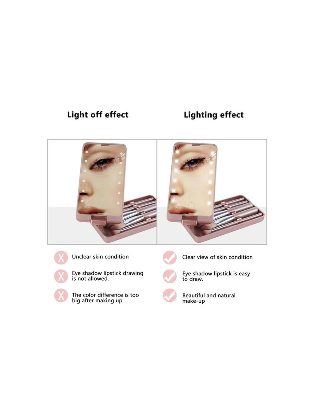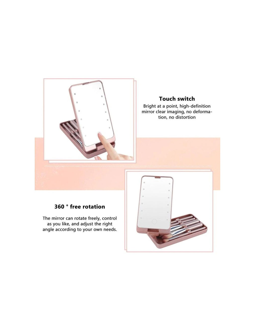 Espelho LED Portátil para MaquilhagemOEspelho LED Portátil para Maquilhagemé o acessório ideal para realizar maquilhagens perfeitas em qualquer lugar. Com um design elegante e funcional, oferece iluminação LED ajustável, permitindo uma visualização clara e precisa, mesmo em ambientes com pouca luz.Características Principais:Espelho com Iluminação LED:Proporciona luz natural e uniforme, perfeita para maquilhagem detalhada.Design Compacto e Portátil:Fácil de transportar, ideal para viagens ou para carregar na mala.Botão Touch Sensível:Controle simples e rápido da iluminação com apenas um toque.Acabamento Elegante:Fabricado com materiais de alta qualidade, garantindo durabilidade e estilo.Benefícios:Iluminação optimizada para maquilhagem em qualquer condição de luz.Compacto e prático, ideal para quem está sempre em movimento.Facilita retoques rápidos durante o dia.Especificações Técnicas:Fonte de Alimentação LED:Bateria recarregável via USB.Dimensões:18 cm x 12 cm x 3 cm.Cor:Branco.Iluminação Ajustável:Três níveis de brilho para diferentes necessidades.Conteúdo da Embalagem:1 x Espelho LED Portátil.1 x Cabo de carregamento USB.Manual do utilizador.