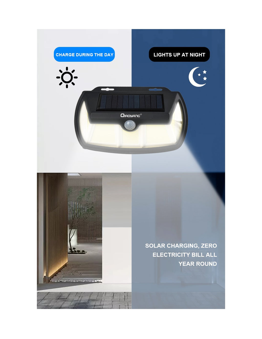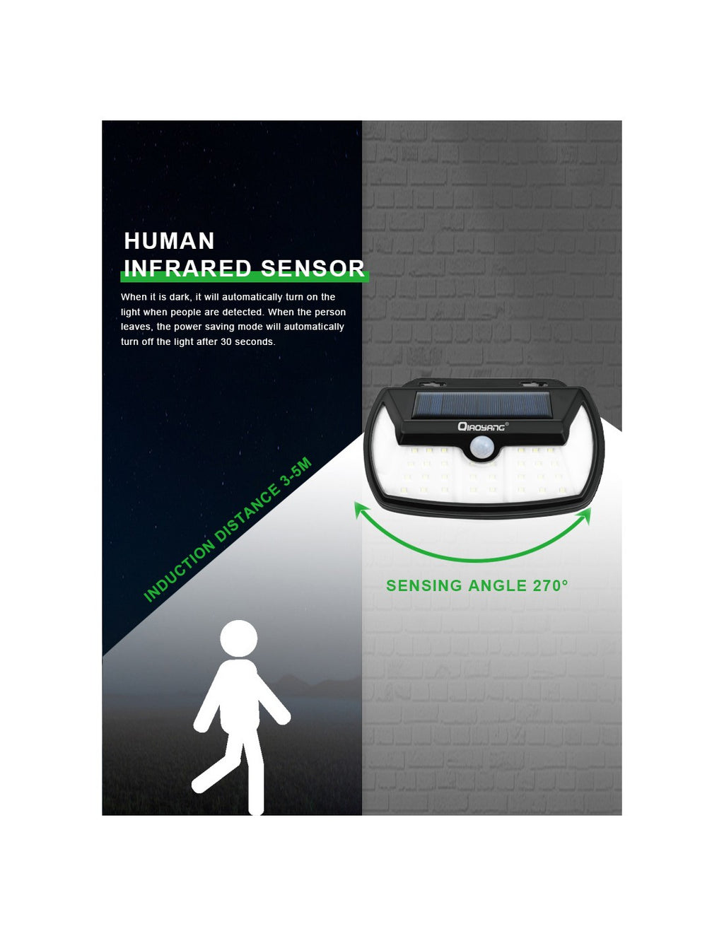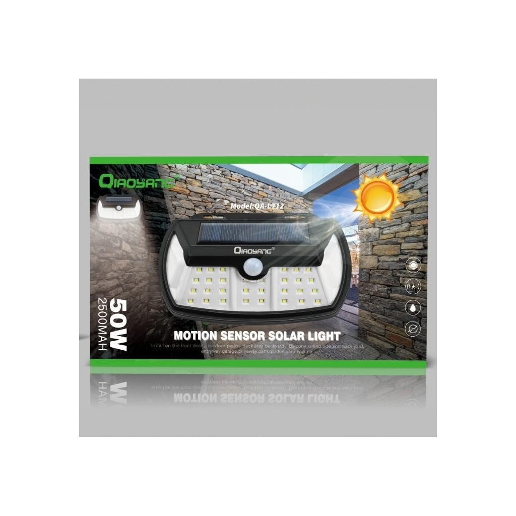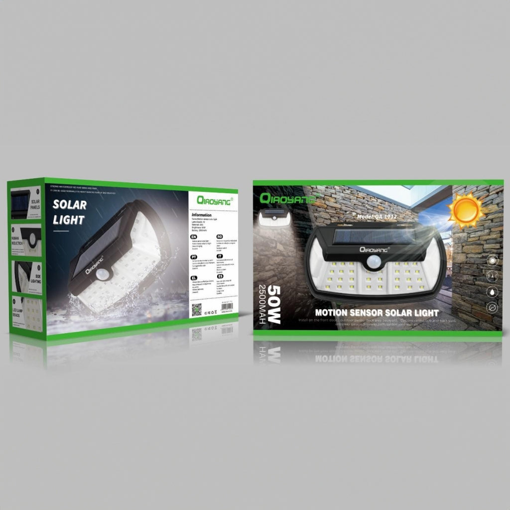 Luz Solar com Sensor de Movimento – Iluminação Eficiente e SustentávelA luz solar com sensor de movimento QA-L212 combina eficiência energética e segurança, ideal para iluminar entradas, jardins, pátios e caminhos. Com 50W de potência e uma bateria de 2500mAh, proporciona iluminação intensa e confiável, mesmo em condições de chuva ou vento.Características Principais:Sensor de Movimento:Acende automaticamente ao detetar movimento, garantindo segurança e economia de energia.Alta Potência de 50W:Iluminação forte e abrangente para áreas externas.Resistência às Intempéries:Design à prova de água e vento, ideal para qualquer condição climática.Bateria de 2500mAh:Longa duração, garantindo horas de iluminação após a carga solar.Fácil Instalação:Não requer cabos, basta fixar na parede e aproveitar a energia solar.Especificações Técnicas:Modelo: QA-L212Potência: 50WBateria: 2500mAhTipo de Luz: LEDSensor: Movimento (ativação automática)Material: ABS resistenteDimensões: 20 x 15 x 8 cmCertificações: CE, RoHS