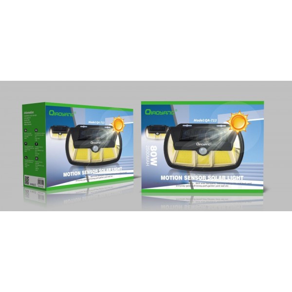 Luz Solar com Sensor de Movimento – Modelo QA-713Proporcione segurança e eficiência ao seu espaço exterior com a Luz Solar QA-713. Este dispositivo oferece uma iluminação potente de 80W, ideal para entradas, jardins, garagens e outros espaços exteriores, garantindo máxima economia de energia.Características Principais:Sensor de Movimento Inteligente:Deteta movimento e acende automaticamente, contribuindo para a segurança e eficiência energética.Potência de 80W:Luz brilhante que ilumina amplas áreas com eficácia.Bateria Duradoura de 2500mAh:Garante horas de iluminação após cada carga solar.Resistência às Intempéries:Material ABS de alta qualidade, à prova de água, ideal para qualquer condição climática.Fácil Instalação:Sem necessidade de fios, basta fixar na parede e aproveitar a energia solar.Especificações Técnicas:Modelo: QA-713Potência: 80WBateria: 2500mAhTipo de Luz: LEDSensor: Movimento (ativação automática)Material: ABS resistenteDimensões: 25 x 20 x 8 cmCertificações: CE, RoHS