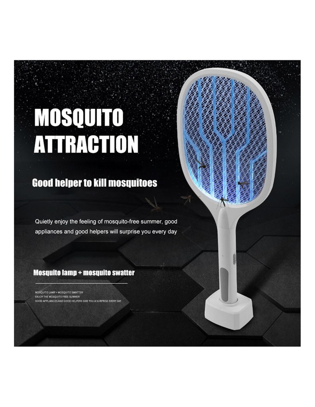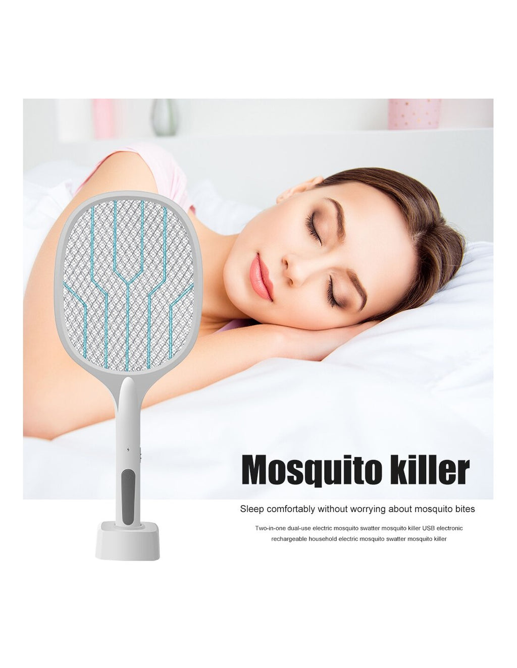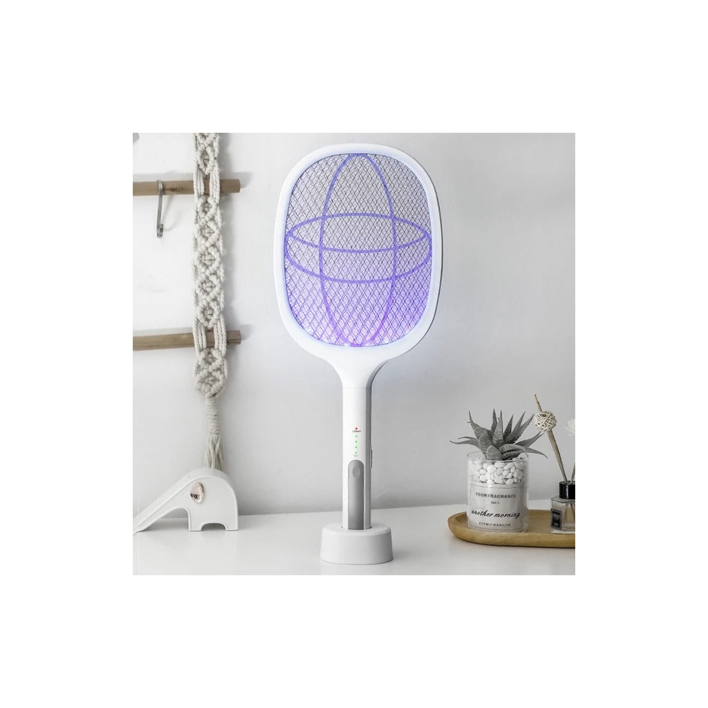 Raquete Elétrica Mata-Insetos com BaseElimine mosquitos e outros insetos de forma prática e eficaz com esta raquete elétrica mata-insetos. Ideal para uso doméstico, oferece proteção contínua contra pragas indesejadas.Características Principais:Dupla Função:Pode ser usada manualmente ou colocada na base para atrair e eliminar insetos automaticamente.Luz UV Integrada:Atrai mosquitos e insetos voadores, maximizando a eficiência.Fácil de Usar:Botão de ligar/desligar com indicador luminoso para maior segurança.Bateria Recarregável:Longa duração com carregamento USB.Leve e Portátil:Design ergonómico e fácil de transportar.Especificações Técnicas:Tensão: 3000VFonte de Energia: USB recarregávelTempo de Carregamento: 2 horasAutonomia: Até 6 horasDimensões: 45 x 22 x 4 cmPeso: 380g