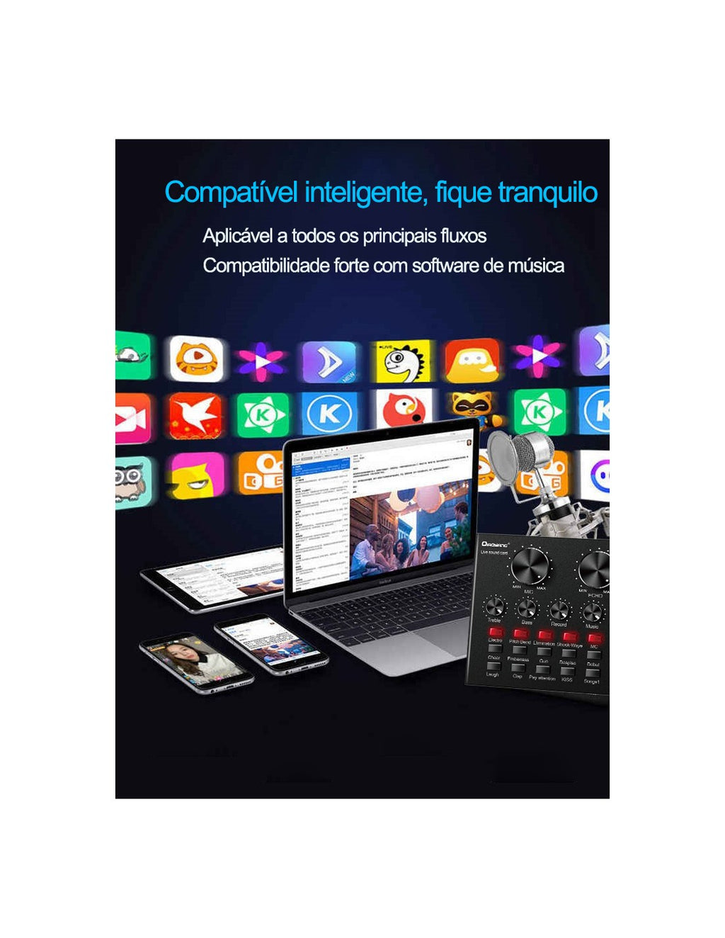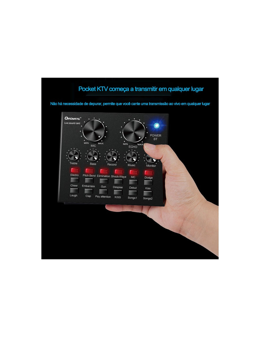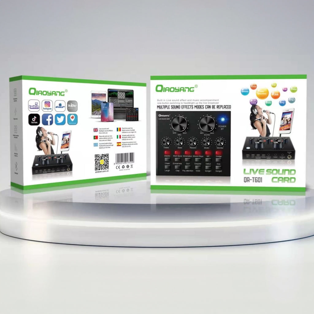 Placa de Som ao Vivo QA-T601 – Experiência de Transmissão InovadoraA Placa de Som ao Vivo QRA-T601 é o equipamento ideal para criadores de conteúdo, streamers e músicos. Com múltiplos efeitos sonoros e funcionalidades avançadas, esta placa de som transforma as suas transmissões em experiências envolventes e profissionais.Características Principais:Efeitos Sonoros Variados:Inclui eco, pitch, eliminação de ruído e efeitos de acompanhamento musical.Compatibilidade Universal:Perfeito para plataformas como Twitch, TikTok, Instagram e YouTube.Conexões Múltiplas:Compatível com telemóveis, tablets, computadores e outros dispositivos de áudio.Interface Intuitiva:Controlo simples e eficiente para ajustar treble, bass, volume e outros parâmetros.Vantagens:Transmissão ao Vivo Profissional:Ideal para streaming, gravações e apresentações ao vivo.Som Personalizado:Ajuste fácil de efeitos e configurações para criar uma assinatura única de áudio.Fácil Instalação:Tecnologia plug and play, permitindo um uso imediato.Especificações Técnicas:Modelo:QA-T601Conectividade:Bluetooth e cabos de áudioFunções:Controlo de eco, música, monitor, e múltiplos efeitos de vozCompatibilidade:iOS, Android e sistemas operativos Windows