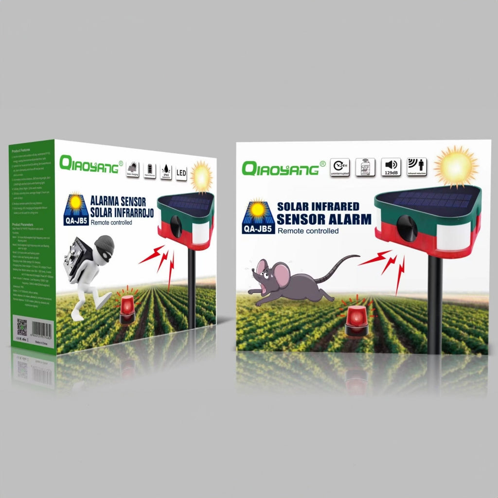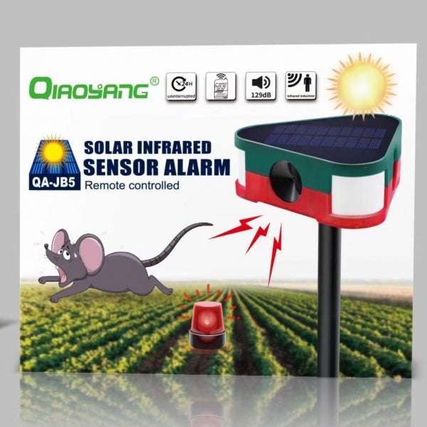 Alarme Solar com Sensor Infravermelho QA-JB5Proteja a sua propriedade de forma eficaz com o Alarme Solar com Sensor Infravermelho QA-JB5. Este dispositivo deteta movimentos de intrusos ou animais indesejados, ativando um alarme sonoro potente.Características Principais:Deteção de Movimento Infravermelho:Capta movimentos com alta precisão, ideal para segurança exterior.Energia Solar:Funcionamento autónomo com painel solar, garantindo sustentabilidade e poupança de energia.Alarme Sonoro de 129dB:Emite um som potente para alertar sobre invasores.Controlado por Comando Remoto:Facilidade de ativação e desativação à distância.Resistência às Intempéries:Construção robusta para suportar chuva, vento e outros fatores climáticos adversos.Especificações Técnicas:Modelo: QA-JB5Tipo de Alarme: Sensor infravermelho e alarme sonoroIntensidade do Som: 129dBAlimentação: Energia solarAlcance do Sensor: Até 8 metrosMaterial: Plástico ABS resistente