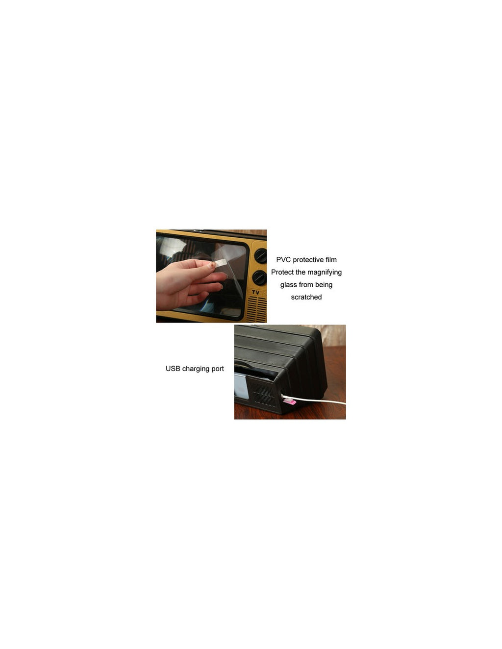 Amplificador de Ecrã com Design Retro TVEste Amplificador de Ecrã com design de TV retro é perfeito para quem adora nostalgia combinada com tecnologia moderna. Ideal para assistir séries, filmes ou vídeos no telemóvel com uma ampliação de ecrã confortável e sem fadiga visual.Características Principais:Design Retro Elegante:Inspirado nas clássicas televisões, acrescenta charme e estilo ao ambiente.Ampliação de Ecrã de Alta Qualidade:Aumenta o tamanho do ecrã do telemóvel, proporcionando uma experiência de visualização imersiva.Compatibilidade Universal:Adequado para telemóveis com tamanhos até 6.8 polegadas.Leve e Portátil:Fácil de transportar e ideal para usar em qualquer lugar, seja em casa, no escritório ou em viagens.Controlo Simples:Basta colocar o telemóvel no suporte traseiro para começar a usar.Especificações Técnicas:Material:Plástico ABS e lente acrílica de alta definiçãoAmpliação:Até 2x o tamanho original do ecrãDimensões:18 cm x 15 cm x 10 cmPeso:300 gCor:Preto com detalhes clássicos